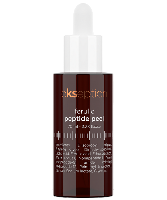 FERULIC PEPTIDE PEEL est un peeling liquide anti-oxydant conçu pour redonner éclat, homogénéité et vitalité aux peaux ternes et fatiguées. Il associe la puissance de l’acide férulique à une combinaison de peptides régénérants et d’acides doux, offrant un équilibre parfait entre exfoliation et protection cellulaire. Sa formulation à pH modéré garantit une action progressive et sécurisée, idéale pour les peaux sensibles ou fragilisées.