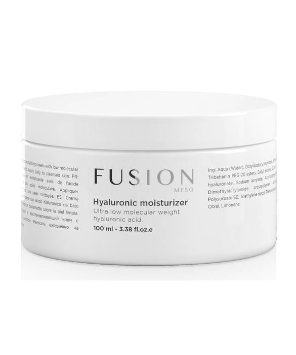 HYALURONIC MOISTURIZER est une crème hydratante à la texture fondante et soyeuse, formulée pour lisser, repulper et revitaliser la peau. En combinant un acide hyaluronique de très petit poids moléculaire et de la glycérine naturelle, cette formule agit à la fois en surface et en profondeur pour restaurer la souplesse et la densité cutanée. Dès l’application, la peau est plus lisse, rebondie et éclatante de vitalité.