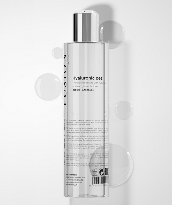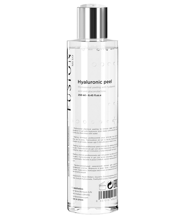 HYALURONIC PEEL est une lotion exfoliante douce qui combine l’action resurfaçante des PHA (gluconolactone) à la puissance hydratante de l’acide hyaluronique.
